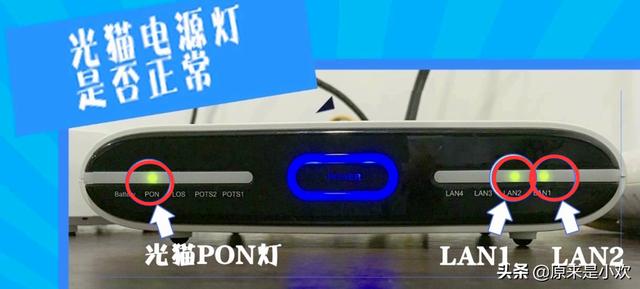 1.点击光猫电源按钮重启光猫,等光猫信号稳定后,查看光猫电源灯是否正常(光猫PON灯、LAN1灯、LAN2灯正常应为绿色)。