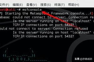 1,在Kali用命令 msfconsole 开启Metasploit (在终端里输入msfconsole)。