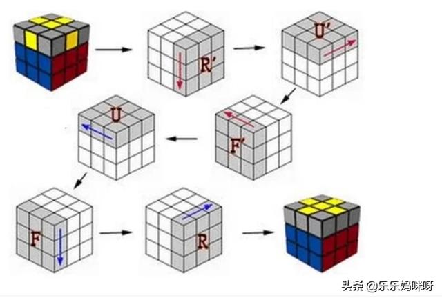 第四步,使顶层棱边归位。可用公式:(前顺,右顺,上顺,右逆,上逆,前逆)
