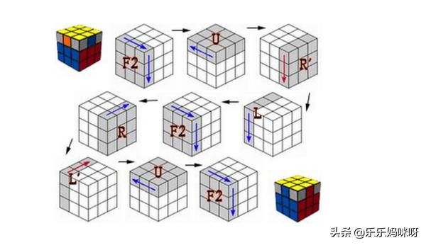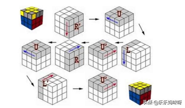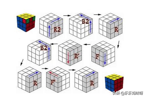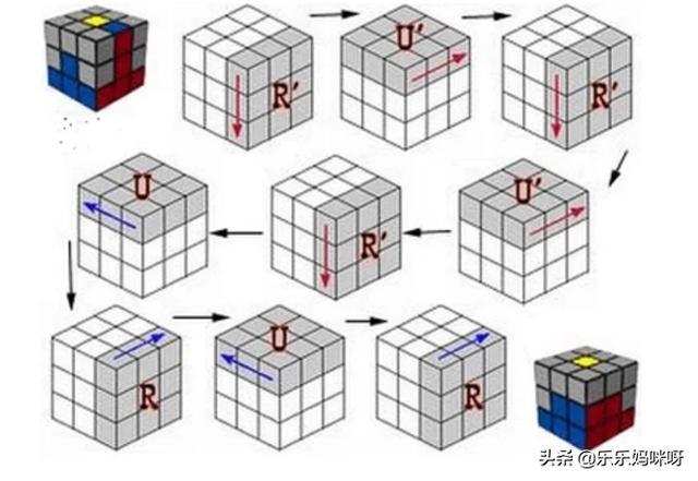 三、中层的四个角(其实是棱块) 1.转动上层,使右边棱块的右边颜色与右手中心块的颜色相同. 2.若此块上面的颜色与前面中心块的艳相同: 右,上,右,上,右,上,右,上,右,上 -,-,-,-,-.+,+,+,+,+ (心中可默念:12345,12345.其实,12345,1234就够了,做两次12345,是为了便于记忆) 3.若此块上面的颜色与后面中心块的艳相同: 右,上,右,上,右,上,右,上,右,上 +,+,+,+,+.-,-,-,-,- (心中可默念:12345,12345) 4.若此块的颜色不符合条件,则将其替换中层符合条件的块,然后再按要求转动.